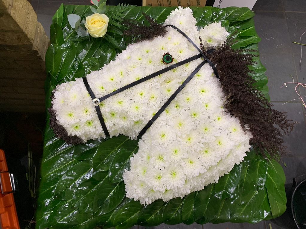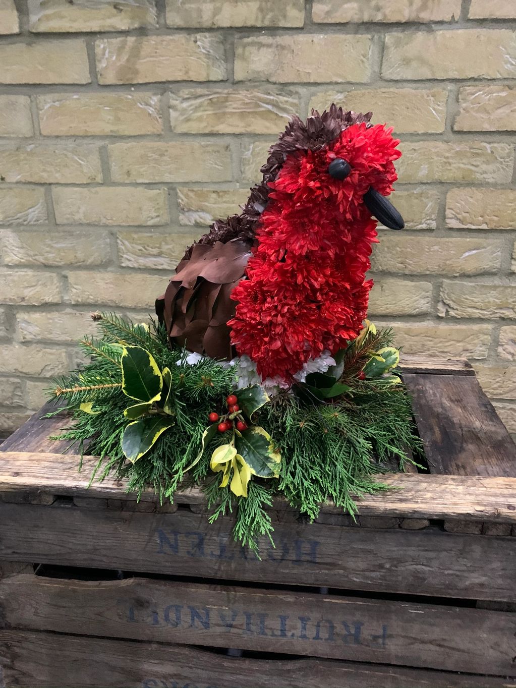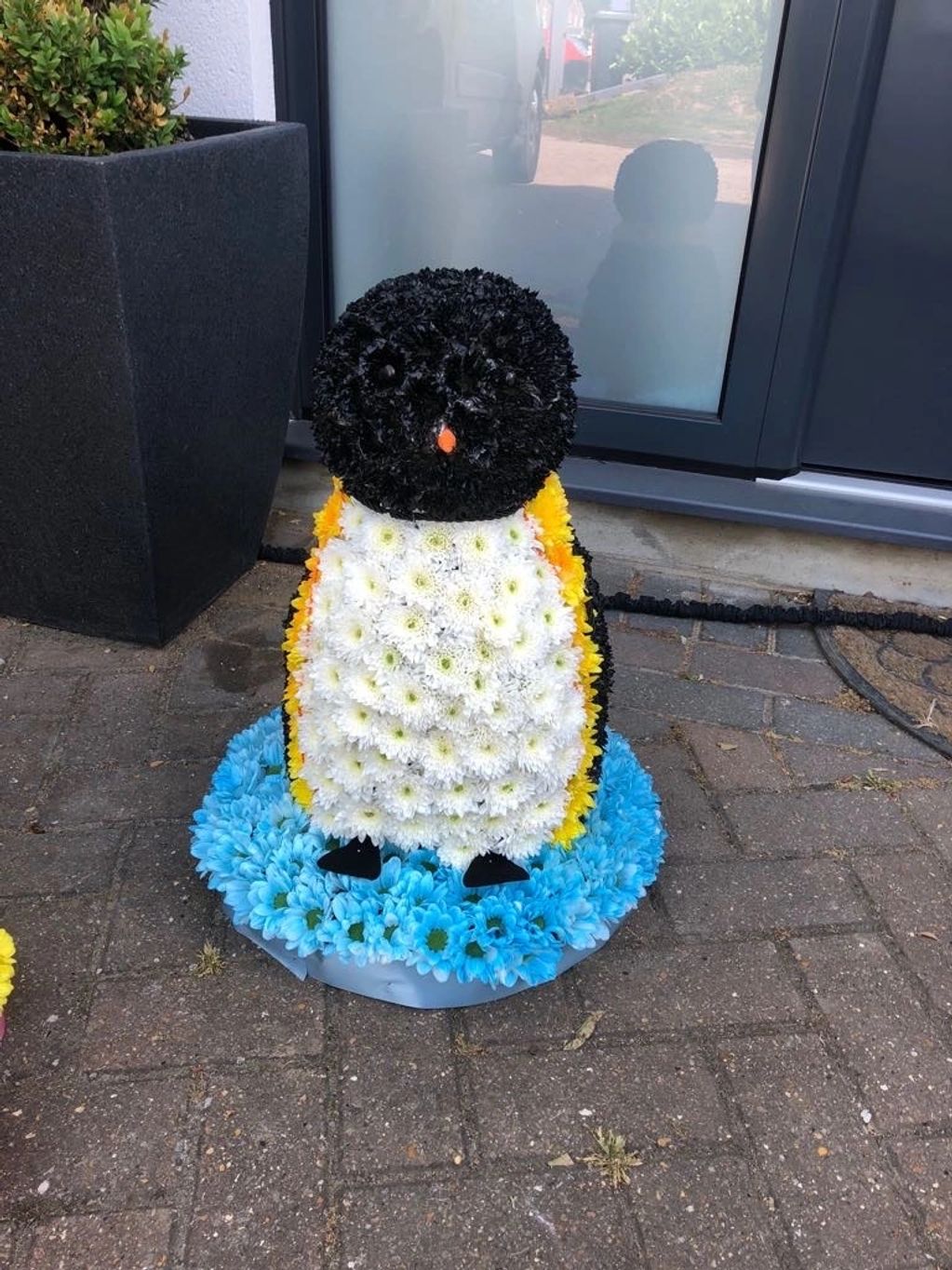 This 3D penguin floral tribute is a beautiful design. Carved and arranged sitting on a round posy pad. Can be made in either a 3D design or flat.