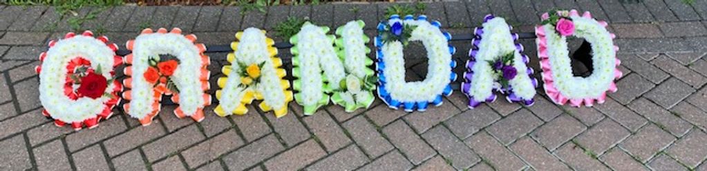 This design is what we call loose lettering. A general mixture of flowers to which ever colour you wanted to choose. Flowers choice and colour can all be changed in here. Please call to discuss your requirements as some flowers are not suitable for the lettering frame.
