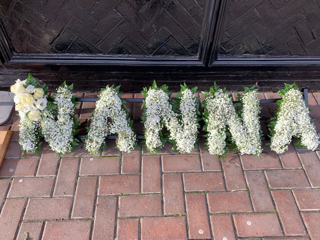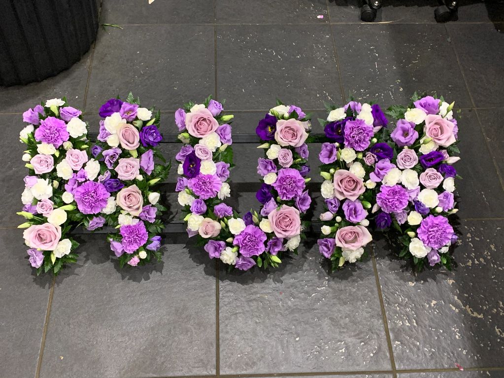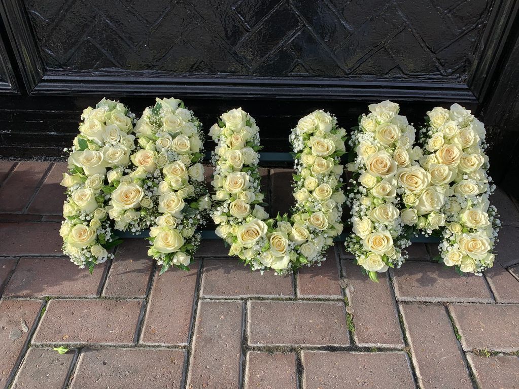Floral letting comes in lots of different designs. The picture you see here is based in a white chrysanthemum, we have a foliage edging which some people prefer to the traditional ribbon. Having a foliage edge means the sprays on each letter which match regardless of colour as the edging is nice and neutral. The pricing is the same for all based lettering reg